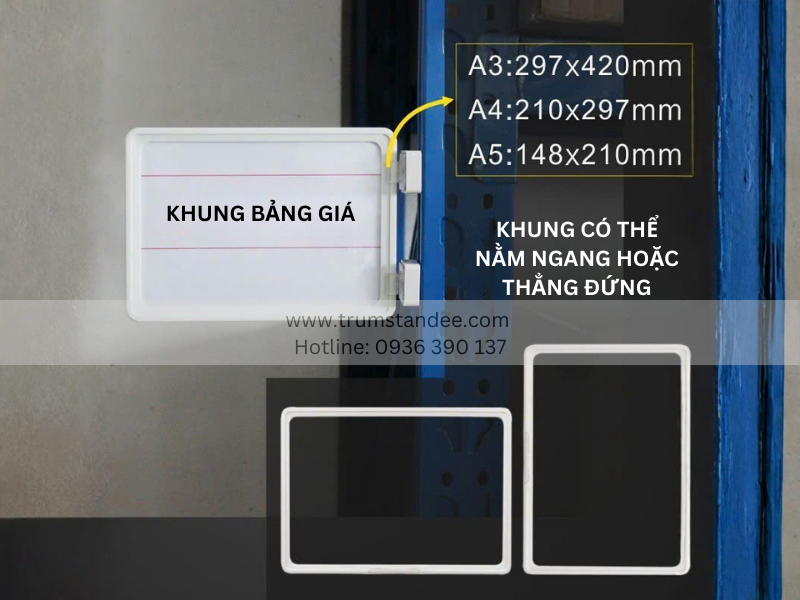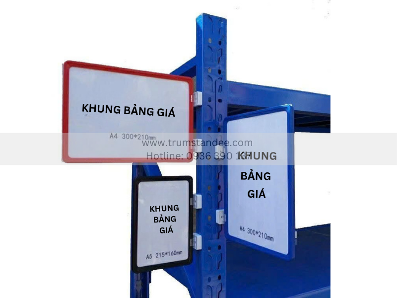 Khung bảng giá có thể kết hợp với chân đế sắt, nam châm, kẹp wobbler hoặc gắn trực tiếp lên kệ, giúp cửa hàng dễ dàng thay đổi bố cục mà không cần khoan đục.