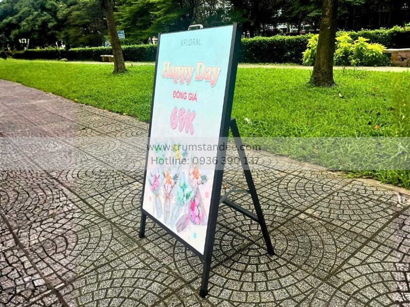 - Standee chữ A 2 mặt: tối ưu hiệu quả hiển thị ở khu vực đông người qua lại, hai chiều di chuyển