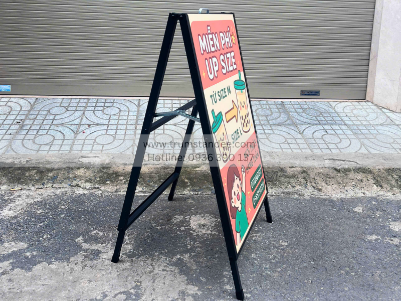 Ngoài ra, standee chữ A có khung kim loại vững chắc hơn, không bị gãy khớp hoặc cong như loại chữ X. Độ ổn định cao giúp nó phù hợp cho sử dụng lâu dài, đặc biệt trong các khu vực ngoài trời.