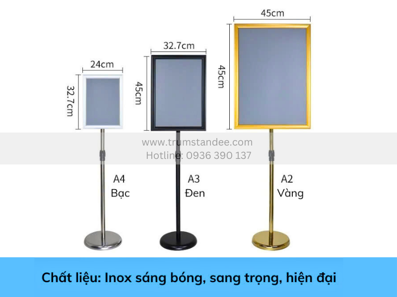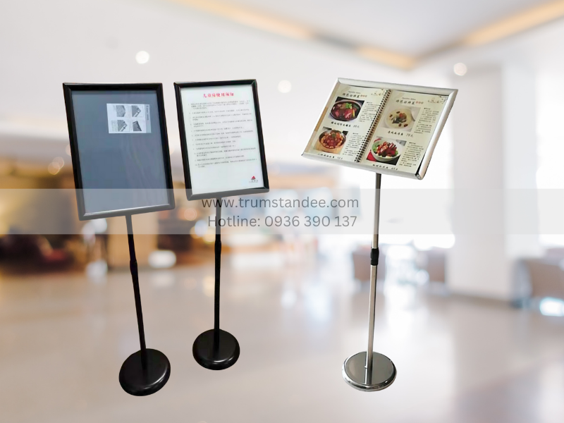 Chân menu inox có thiết kế gọn nhẹ nhưng chắc chắn, không chiếm nhiều diện tích sàn. Sản phẩm có thể đặt tại: