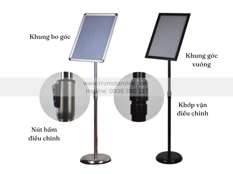 Chân menu inox được thiết kế với nhiều tùy chọn để phù hợp với từng nhu cầu trưng bày cụ thể: